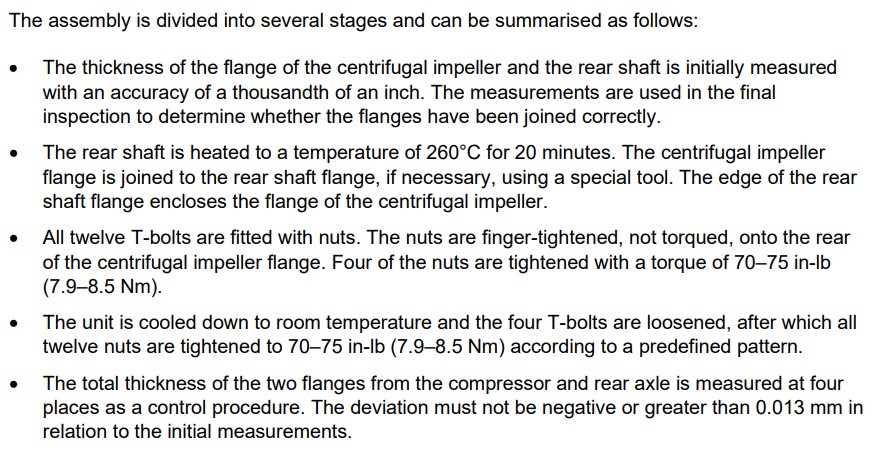 balancing of the compressor rotor. The work order showed, among other things, that twelve new T-bolts had been used during assembly.