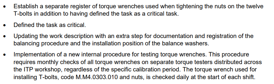 The NSIA believes that the engine Shop Manual GEK 105175 can be improved to reduce the risk of human error with more clear wording between the worksteps and figures. In addition could an additional work step be established in the Shop Manual where the twelve T-bolts nuts are rechecked for correct tightening torque in the final inspection after the installation of the balance weights.